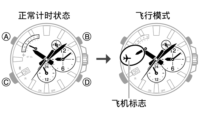 在医院里、飞机上或其他禁止无线电波的地方时,请按下手表的 (A) 按钮约四秒以进入“飞行模式”。