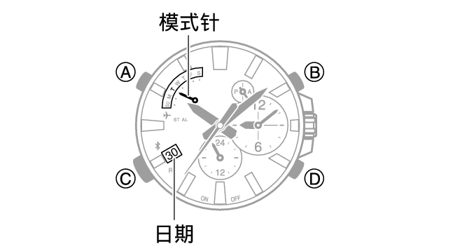 更改指针和日期设置 模式针和日期指示器移动 更改手表的日期设定也会导致模式针移动。 日 在计时到达午夜后,日期可能要花 90 秒到三分钟的时间才会改变。模式针会随着日期的改变而移动。 当手表的表冠拉出时日期显示可能不正确。