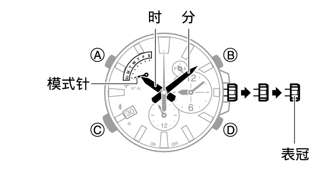 这样将使秒针移至 12 点位置,模式针移至 SU 并启用时针和分针设置操作。