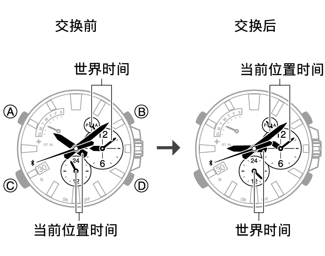 切换当前位置时间和世界时间 1. 点击“CASIO WATCH+”图标。 2. 按下(C)约 0.5 秒直至秒针指向 R。 当手表与手机建立连接时,秒针将移至 。 3. 点击 “世界时间”。 4. 点击 “Home time World time”。 5.执行手机显示屏上显示的操作以切换您的当前位置时间和“世界时间”。