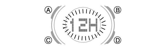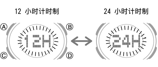 按(D)以在 [12H](12 小时计时制)和 [24H](24 小时计时制)之间切换设置。