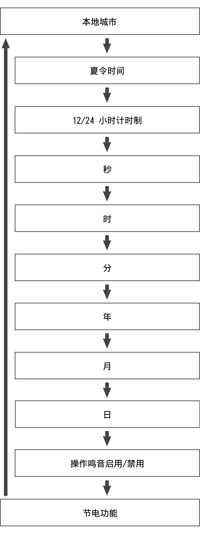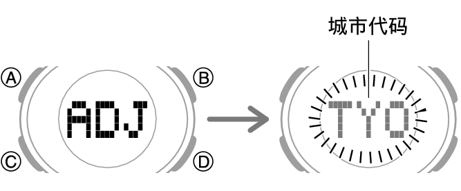 如果由于某种原因,您不能使用时间信号接收来调整当前时间设置,您可以使用手表按钮操作手动调整日期、时间和本地城市设置。