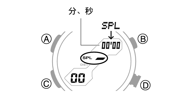 每次按下 (A) 可在 [SPL](分段时间)和 [LAP](每圈时间)之间切换。