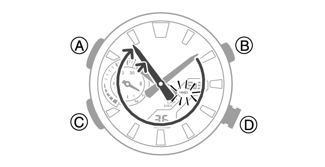 模块编号 5710 移动指针以读取数字显示屏 移动指针使其移开,方便查看显示信息。 按住 (B) 时,按下 (C)。 这将移动长短指针,从而便于查看显示屏信息。 要使指针返回其正常计时状态位置,请再次在按住 (B) 时按下 (C),或按下 (C) 以切换至其他模式。 注 如果您移动手表指针且在约一小时内未执行任何操作,指针将自动恢复正常计时状态。
