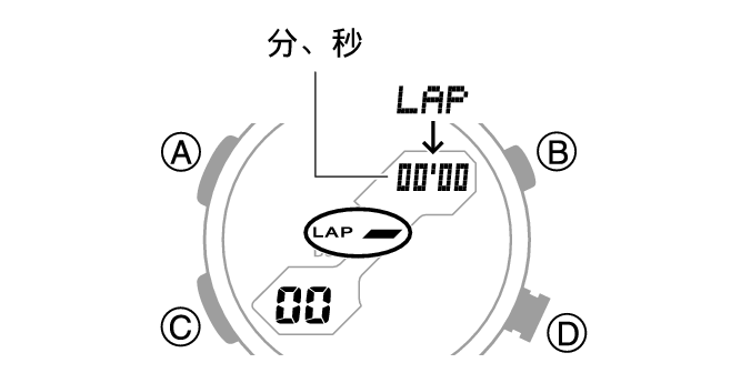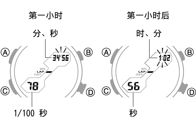 每次按下 (A) 后,手表将显示自上次每圈时间操作以来运行的时间(每圈时间),交替显示秒表数字约八秒钟。