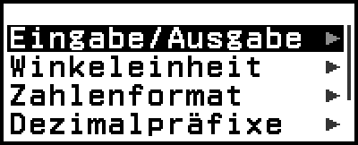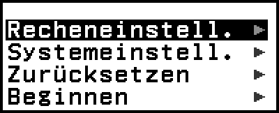 | Recheneinstell. | Enthält Menüpositionen zum Konfigurieren von Berechnungseinstellungen wie z. B. das Anzeigeformat für Berechnungsergebnisse. |
