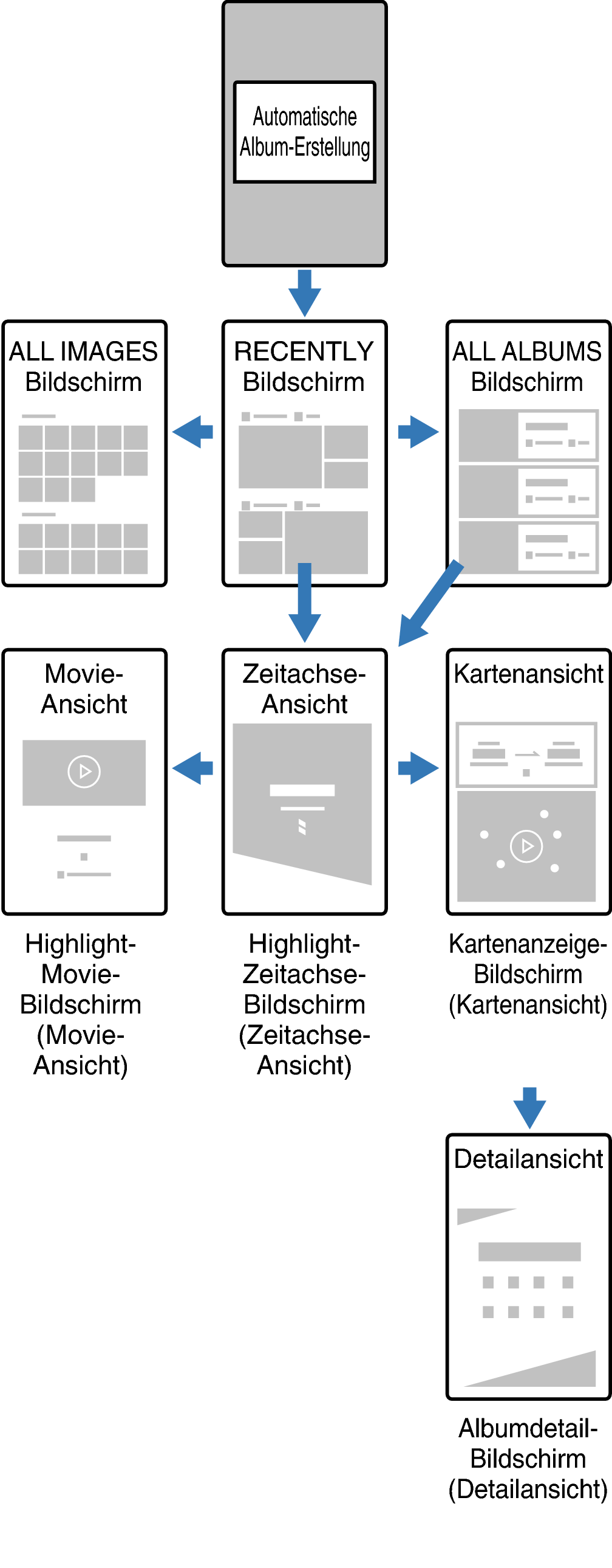 Unter den Bildern, die in einem erstellten Album enthalten sind, können die Highlights eines Tages ausgewählt und in chronologischer Reihenfolge in einer Highlight-Zeitachse angezeigt oder zu einem Highlight-Movie zusammengestellt werden. Dies macht es einfach, die Höhepunkte des Tages wieder Revue passieren zu lassen.