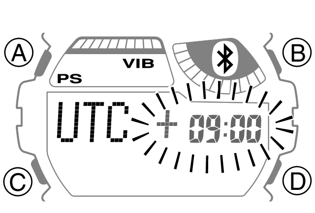 - Halten Sie im Uhrzeitmodus A ungefähr zwei Sekunden lang gedrückt, bis das Fenster mit den Zeitzoneneinstellungen angezeigt wird.