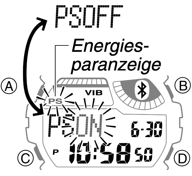 - In Abhängigkeit der jeweiligen Energiespareinstellung wird entweder [PSON] (Power Saving ON, Energiesparmodus EIN) oder [PSOFF] (Power Saving OFF, Energiesparmodus AUS) angezeigt.