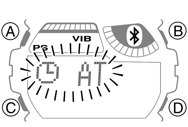 - Halten Sie im Uhrzeitmodus A mindestens fünf Sekunden lang gedrückt. Halten Sie A gedrückt, bis beide unten beschriebenen Vorgänge abgeschlossen sind.