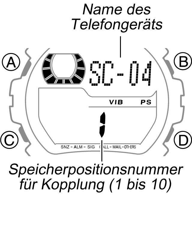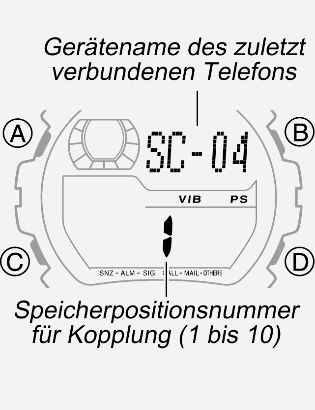 - Verwenden Sie auf der Uhr die Taste D, um durch die Speicherpositionen für die Kopplung zu blättern, bis die Position für das Telefon angezeigt wird, mit dem Sie eine Verbindung herstellen möchten.