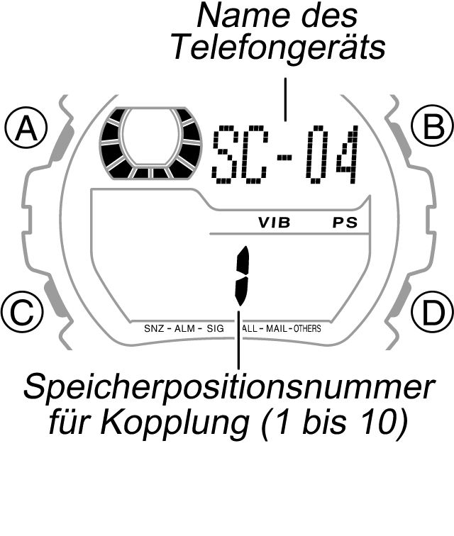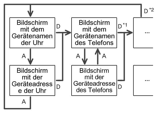 *2 Durch Drücken der Taste D nach der Anzeige der Bildschirme mit den Gerätenamen aller gekoppelten Telefone kehren Sie zum Bildschirm mit dem Gerätenamen der Uhr zurück.