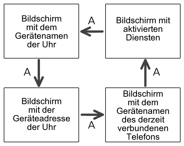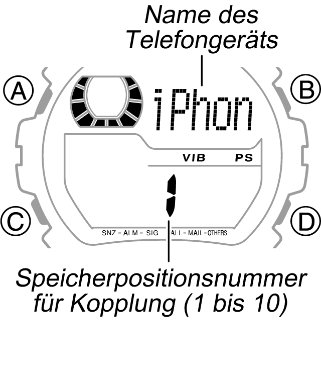 *2 Durch Drücken der Taste D nach der Anzeige der Bildschirme mit den Gerätenamen aller gekoppelten Telefone kehren Sie zum Bildschirm mit dem Gerätenamen der Uhr zurück.