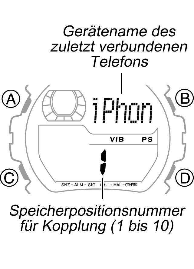 - Wenn das Bluetooth-Symbol auf der Uhr angezeigt wird, wechseln Sie in den Uhrzeitmodus, und halten Sie die Taste B ungefähr zwei Sekunden lang gedrückt, bis das Symbol nicht mehr angezeigt wird