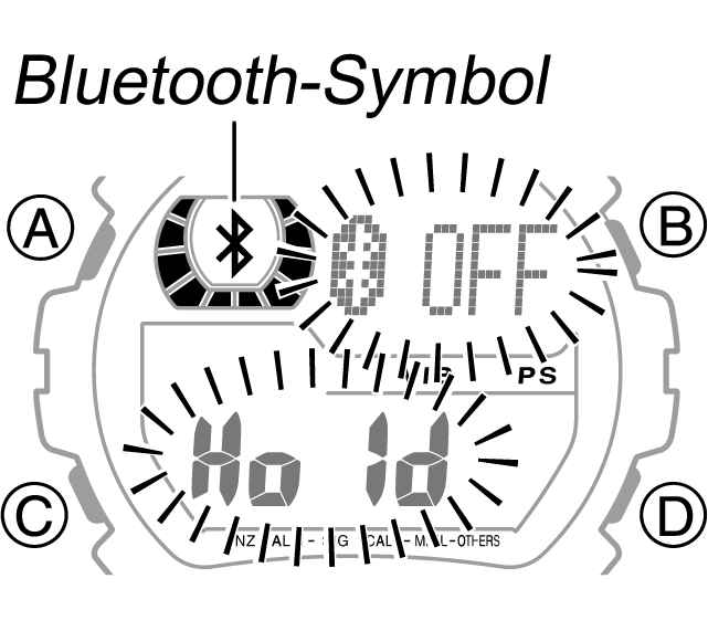 Wenn Sie sich in einem Krankenhaus, Flugzeug oder anderswo befinden, wo die Nutzung von Funksignalen verboten ist, können Sie das Aussenden von Signalen deaktivieren, indem Sie im Uhrzeitmodus die Taste B ungefähr zwei Sekunden lang gedrückt halten. Das Bluetooth-Symbol wird dann nicht mehr auf dem Uhren-Display angezeigt.