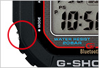 Wenn sich IhreG-SHOCK -Uhr im Uhrzeitmodus befindet, halten Sie die im Foto nebenan mit einem roten Kreis gekennzeichnete Taste ca. zwei Sekunden lang gedrückt, bis die Bluetooth-Anzeige im Display erscheint.
