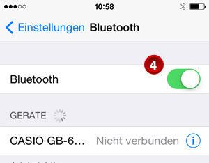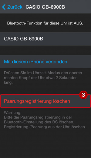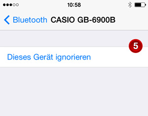 , und tippen Sie dann auf den angezeigten Text „Dieses Gerät ignorieren“.Dadurch wird „CASIO GB-******“ nicht mehr auf dem Display angezeigt, was darauf hinweist, dass die Paarungsinformationen auf dem Telefon gelöscht wurden.