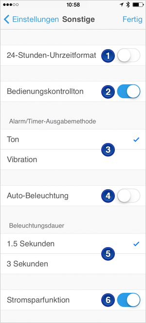 6Aktiviert bzw. deaktiviert die Stromsparfunktion der Uhr.