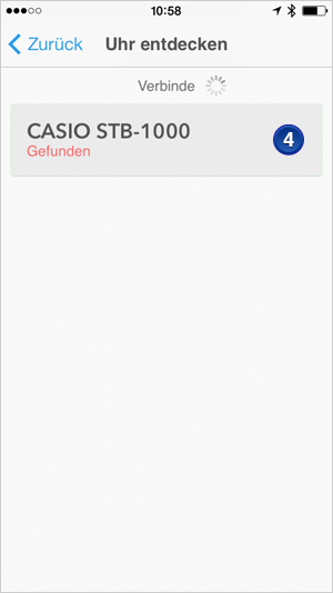 Kehrt die Uhr in den Zeitmessermodus zurück und das Bluetooth-Symbol wird nicht angezeigt. Tippen Sie in diesem Fall einmal oder so oft wie notwendig links oben im Telefon-Display auf „Zurück“, um zum Hauptmenü der CASIO WATCH+-App zurückzukehren, und führen Sie dann die Schritte oben ab Schritt 2 erneut aus.