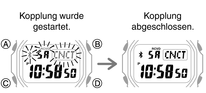 - Wenn die Kopplung aus irgendeinem Grund fehlschlägt, wird [NG] vorübergehend auf dem Display angezeigt und anschließend der normale Uhrzeitmodus fortgesetzt. Wiederholen Sie den Kopplungsvorgang von Anfang an.