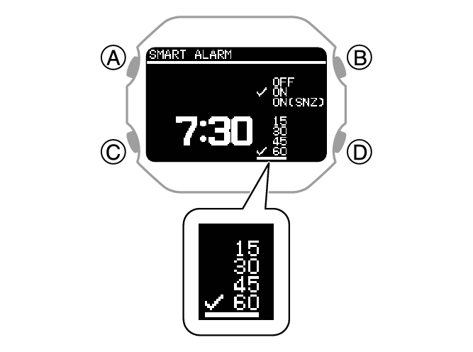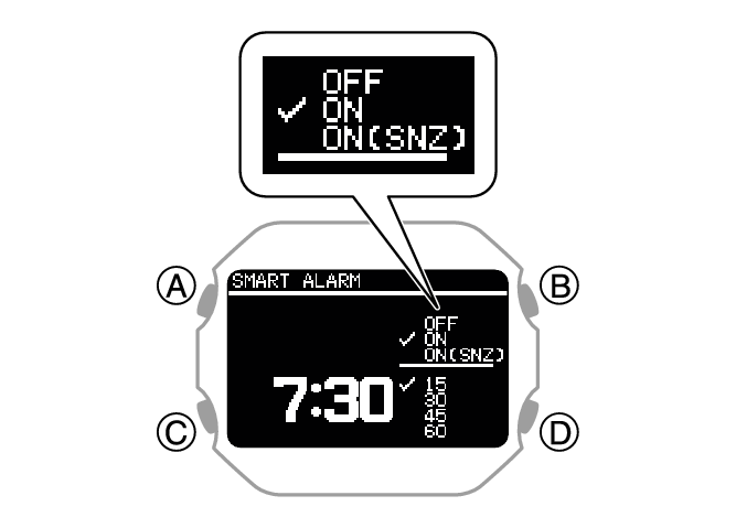Verwenden Sie (C), um die gewünschte Einstellung EIN/AUS für den Smart-Alarm und die Schlummerfunktion auszuwählen.