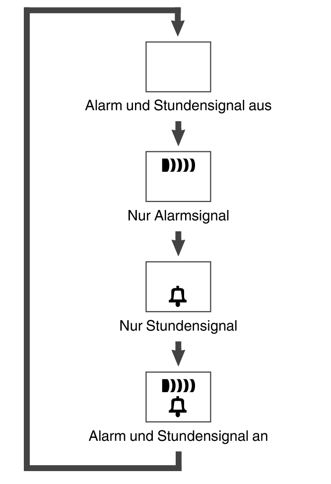 -Symbol (Stundensignal) zwischen ein (angezeigt) und aus (nicht angezeigt) umgeschaltet.