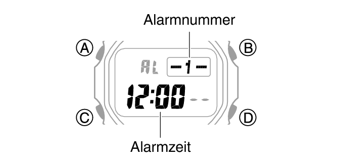 Halten Sie im Alarmmodus die Taste (D) gedrückt, um den Alarm auszugeben.