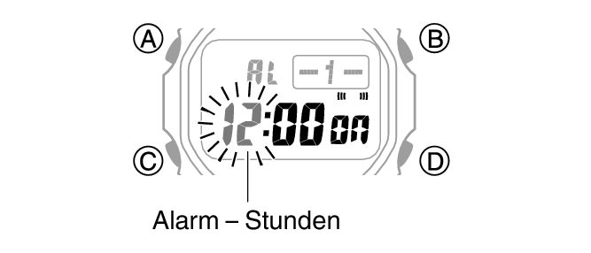 Halten Sie (A) mindestens zwei Sekunden lang gedrückt. Lassen Sie den Knopf los, wenn die Stundenanzeige zu blinken beginnt.