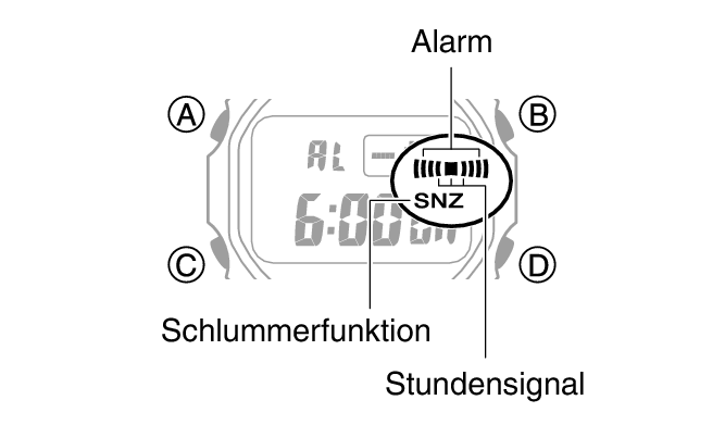 Die Anzeigen werden angezeigt, wenn einer der Alarme oder das Stundensignal eingeschaltet ist.