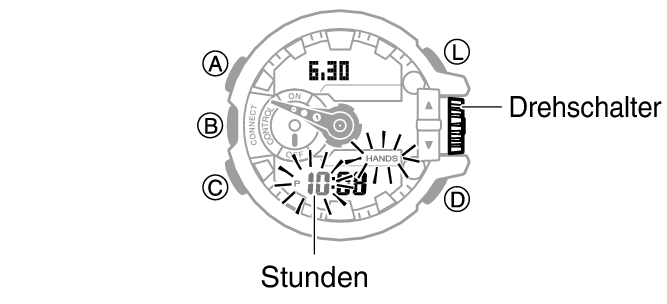 - Wenn sich die Sekundenanzeige beim Drücken zwischen 30 und 59 befindet (D), wird die Minutenanzeige um den Wert 1 erhöht.