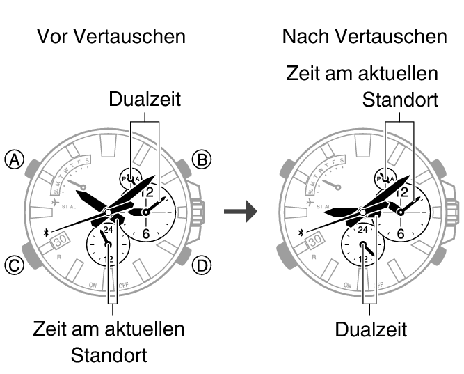Sie können die Uhrzeit an Ihrem aktuellen Standort mit der Dualzeit tauschen, indem Sie (B) ca. drei Sekunden lang gedrückt halten.