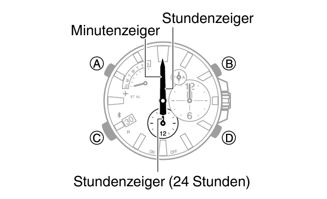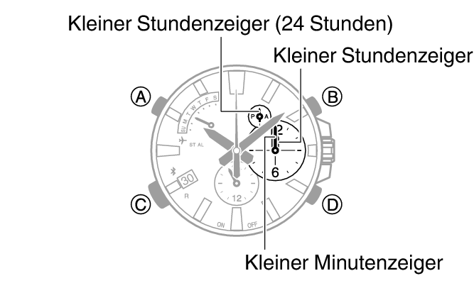 Dies ermöglicht die Anpassung der Ausrichtung des kleinen Stundenzeigers, des kleinen Minutenzeigers und des kleinen 24-Stundenzeigers.