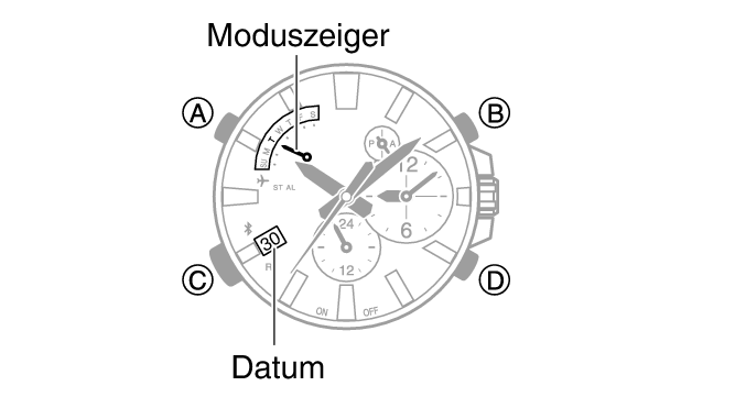 Bei einer Änderung der Datumseinstellung der Uhr bewegt sich auch der Moduszeiger.