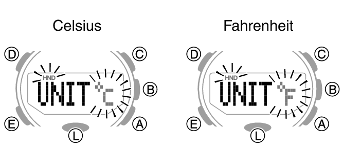 Daraufhin wird [UNIT °C] angezeigt, und entweder [°C] blinkt, oder [UNIT °F] mit [°F] blinkt.