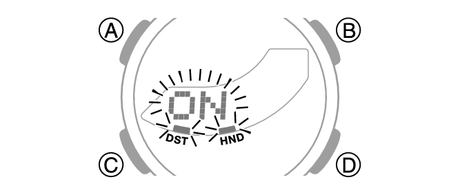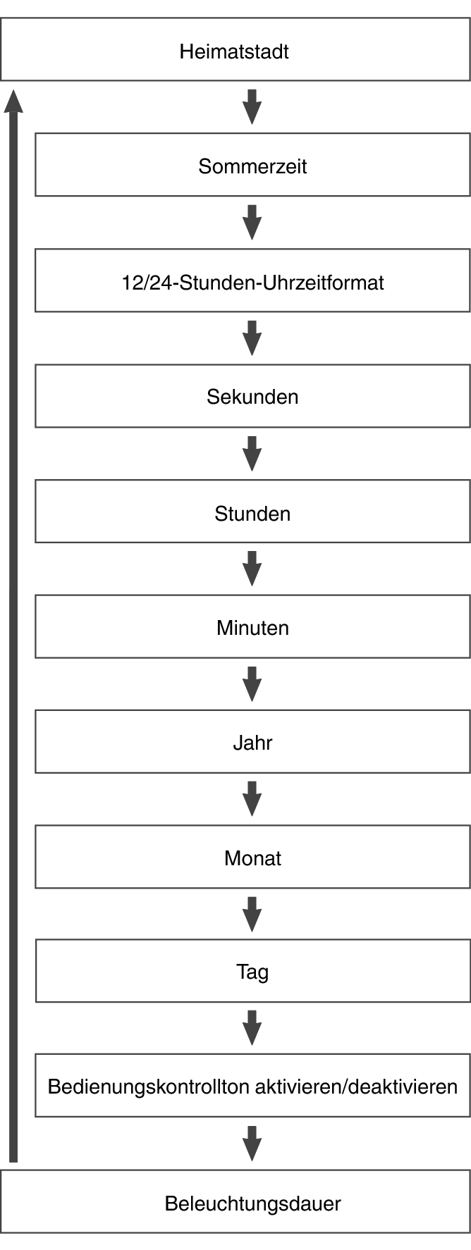 Halten Sie (A) mindestens zwei Sekunden lang gedrückt. Lassen Sie den Knopf los, wenn der Name der aktuell ausgewählten Heimatstadt auf dem Display angezeigt wird.