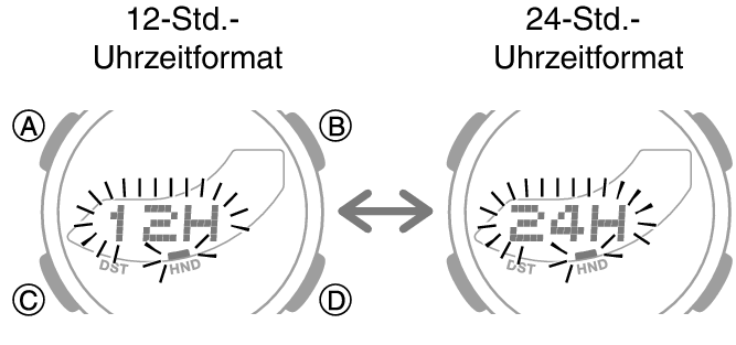 Drücken Sie (B) oder (D), um [12H] (12-Std.-Uhrzeitformat) oder [24H] (24-Std.-Uhrzeitformat) auszuwählen.