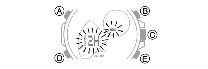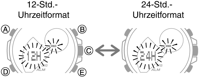 Drücken Sie (E), um [12H] (12-Stunden-Uhrzeitformat) bzw. [24H] (24-Stunden-Uhrzeitformat) auszuwählen.