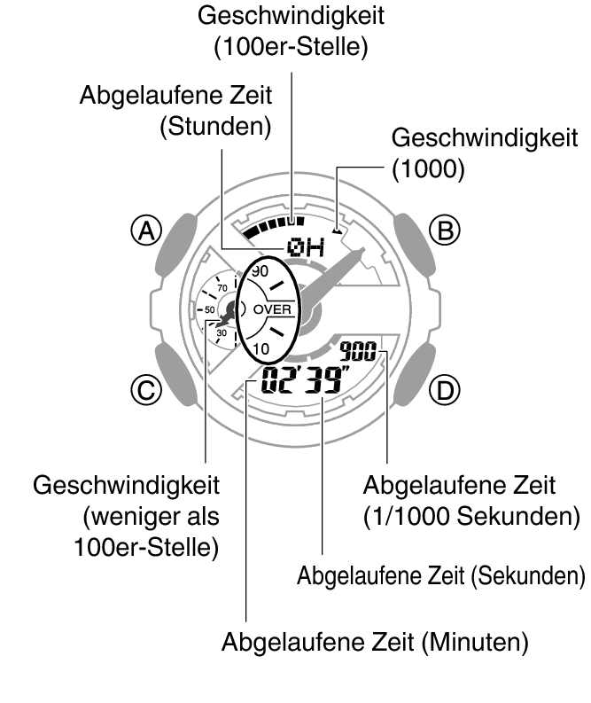 Bei der Messung der abgelaufenen Zeit im Stoppuhrmodus wird der Geschwindigkeitswert durch die Division der angegebenen Distanz durch die gemessene abgelaufene Zeit (in Stunden) ermittelt.
