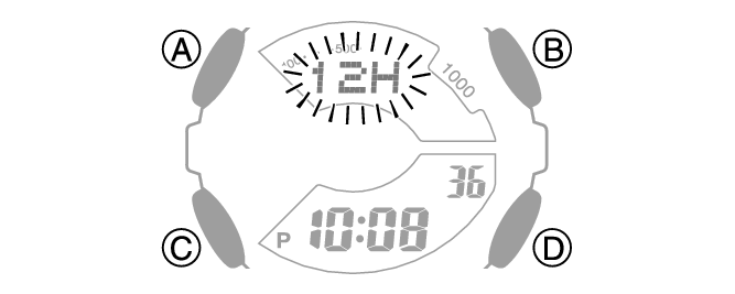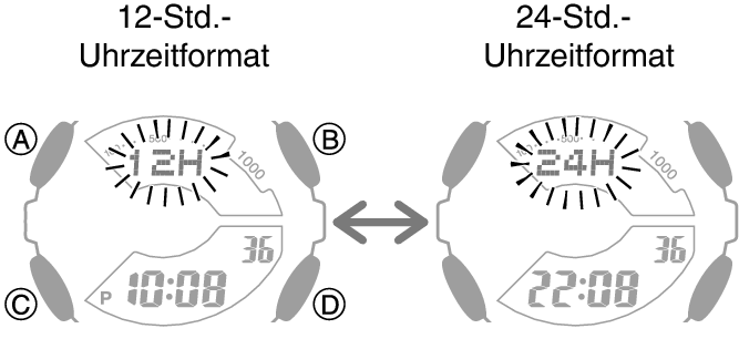 Drücken Sie (D), um [12H] (12-Stunden-Uhrzeitformat) bzw. [24H] (24-Stunden-Uhrzeitformat) auszuwählen.