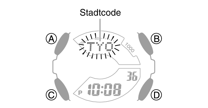 Halten Sie (A) mindestens drei Sekunden lang gedrückt. Lassen Sie den Knopf los, wenn der Stadtcode zu blinken beginnt.