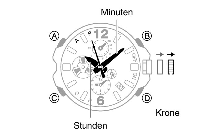 Drehen Sie die Krone, um die Stunden und Minuten einzustellen.