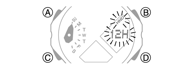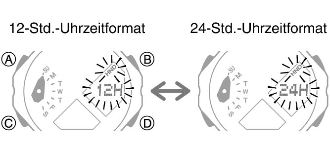 Drücken Sie (B) oder (D), um [12H] (12-Std.-Uhrzeitformat) oder [24H] (24-Std.-Uhrzeitformat) auszuwählen.
