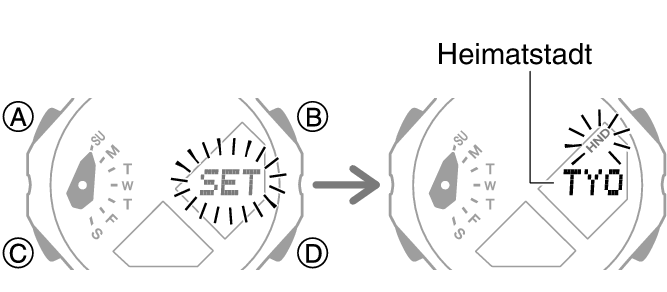 Halten Sie (A) mindestens zwei Sekunden lang gedrückt. Lassen Sie den Knopf los, wenn der Name der aktuell ausgewählten Heimatstadt auf dem Display angezeigt wird.