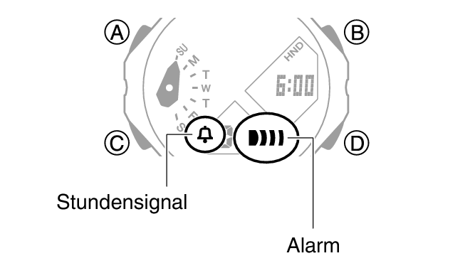 Die Anzeigen werden angezeigt, wenn einer der Alarme oder das Stundensignal eingeschaltet ist.