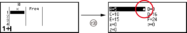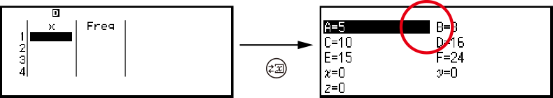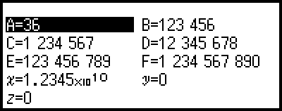 displays a screen that shows the values currently stored to variables A, B, C, D, E, F, x, y, and z. On this screen, values are always displayed using the "Norm 1" Number Format. To close the screen, press