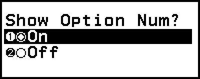 Option Numbers are displayed when "On" is selected for the Show Option Num setting on the SETTINGS menu and not displayed when "Off" is selected. The default setting is On. Note that menu operations you execute by pressing number and symbol keys remain in effect even when "Off" is selected for the Show Option Num setting.
