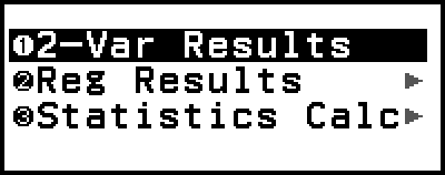 Select [1-Var Results], [2-Var Results], or [Reg Results] to see a list of calculation results based on the data you entered. For details, see "Displaying Statistical Calculation Results".