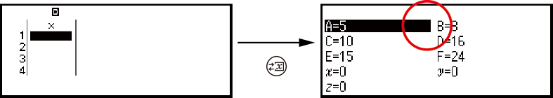 displays a screen that shows the values currently stored to variables A, B, C, D, E, F, x, y, and z. On this screen, values are always displayed using the "Norm 1" Number Format. To close the screen, press