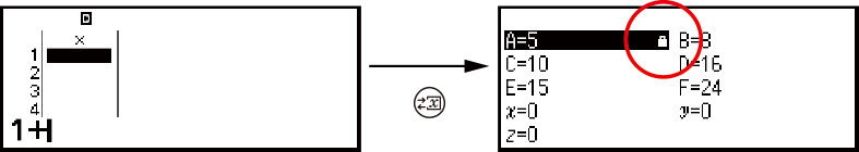 displays a screen that shows the values currently stored to variables A, B, C, D, E, F, x, y, and z. On this screen, values are always displayed using the "Norm 1" Number Format. To close the screen, press