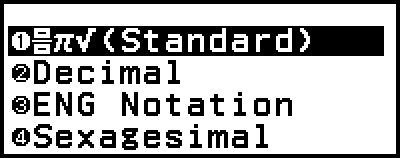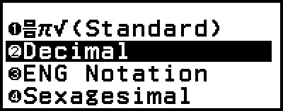 Standard is a format that displays a calculation result in a form that includes a fraction, √ , or π when possible. Decimal is a format that displays the calculation result as a decimal value.